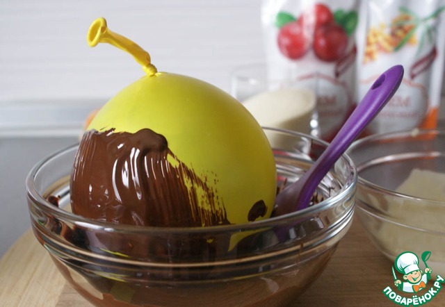 Шоколад растопить на водяной бане или в микроволновке. Пока топится шоколад заняться подготовкой шоколадных форм. Для того чтобы приготовить шары-формы понадобятся шарики. Обычные надувные шарики нужно надуть до подходящего размера. В оригинальном варианте они размером с боулинговый шар, но поскольку мы готовим домашний вариант их можно сделать намного меньше. Надутые и хорошо завязанные шарики нужно тщательно вымыть с мылом, ополоснуть и высушить. После этого слегка смазать их растительным или растопленным сливочным маслом (в идеале какао маслом) и отправить шарики в холодильник.