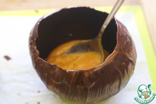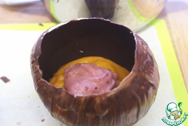 Теперь достаем шоколадные формы-шары и наполняем их мороженым из хурмы.