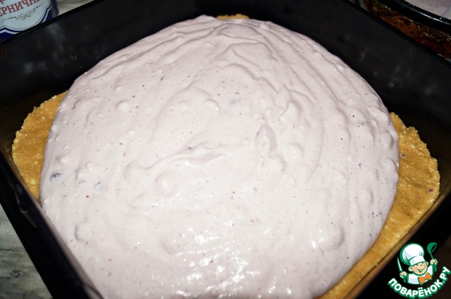 Смешиваем творожно-черничную смесь с остывшим заварным кремом. Аккуратно вводим взбитые белки в 2 этапа, круговыми движениями от центра к краю.