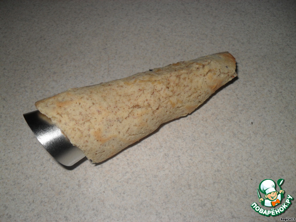 Широким ножом аккуратно отделим кружок от пергамента, накрутим его на металлический конус для выпечки трубочек, предварительно смазанный растительным маслом, и вернем в духовку еще минут на 5-7, пока не подрумянятся края.
