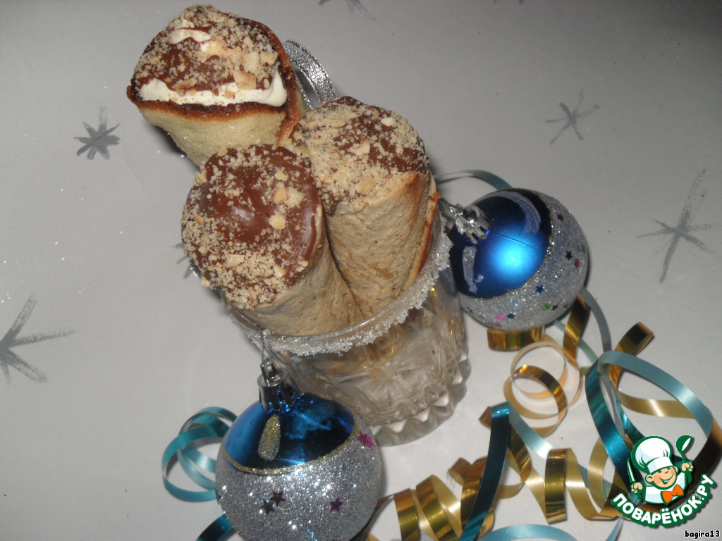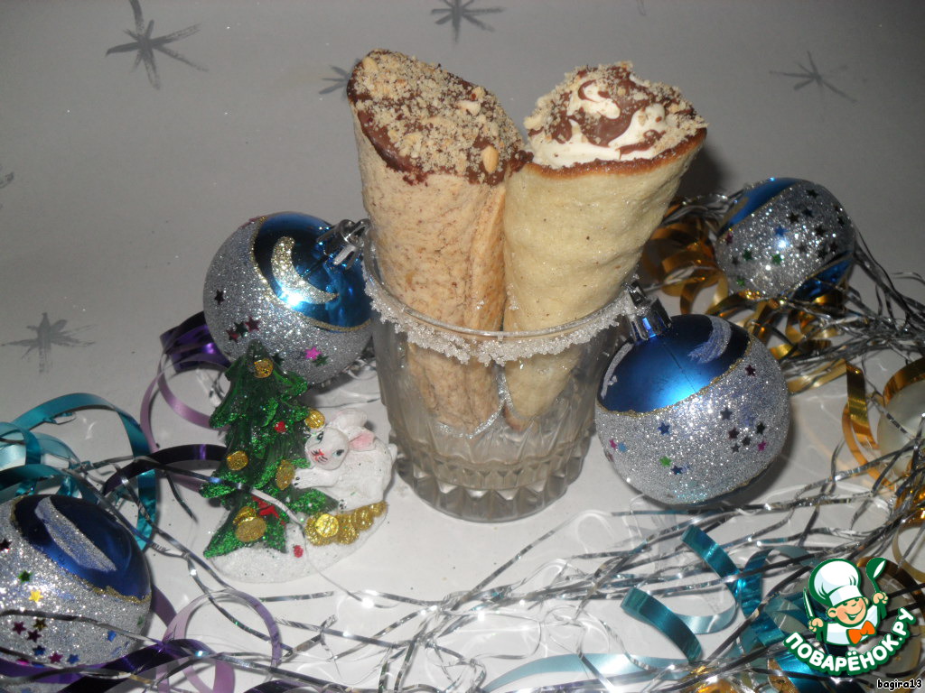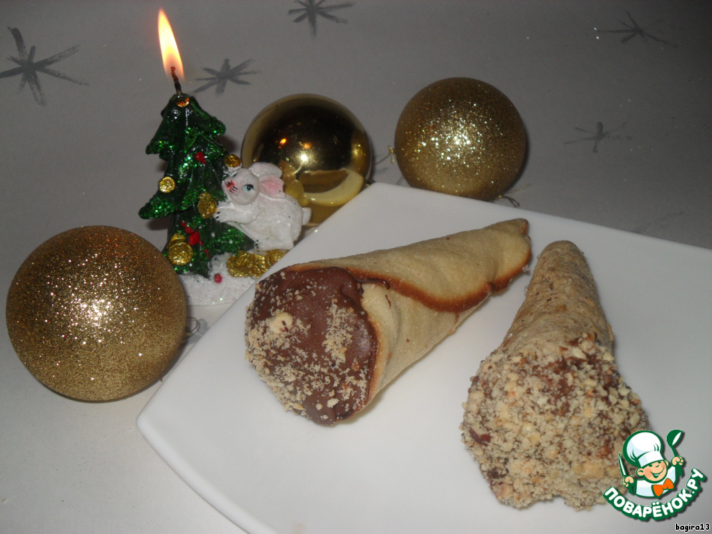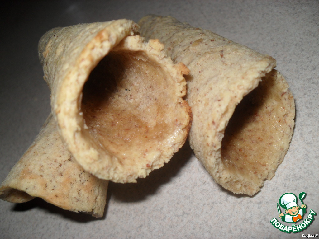 Затем вынимаем из духовки, и пока выпеченный кружок еще горячий, быстро сворачиваем его в виде рожка. Для придания формы можно воспользоваться металлическими конусами для трубочек, предварительно смазав их растительным маслом: быстро накрутить выпеченный кружок на конус (так, чтобы нижняя часть кружочка оказалась внутри), а затем вынуть его. Выпеченное тесто довольно быстро остывает и теряет пластичность, поэтому делать все нужно быстро, и лучше выпекать по одному кружочку. Из указанной порции продуктов получается 6-8 рожков (в зависимости от диаметра).