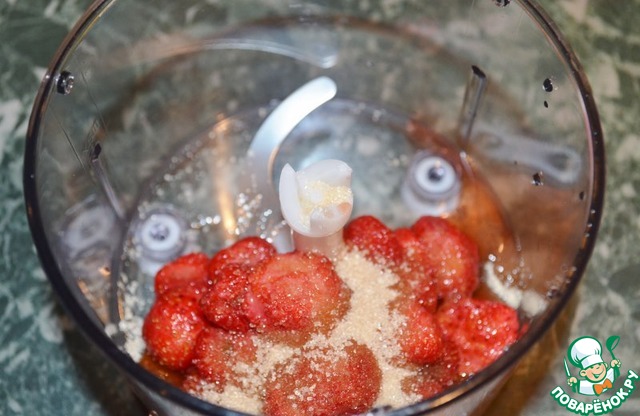 Если клубника замороженная: разморозьте и слейте лишнюю жидкость. Если свежая: вымойте и обсушите. Измельчите вместе с сахаром с помощью блендера.