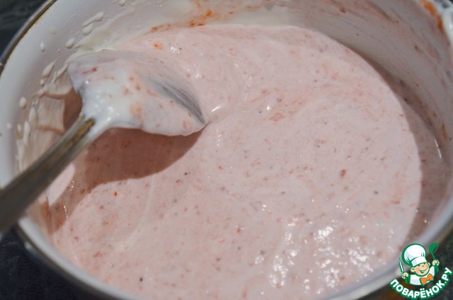 В оставшийся крем добавьте 1/3 клубничного пюре и хорошо размешайте до однородного цвета.