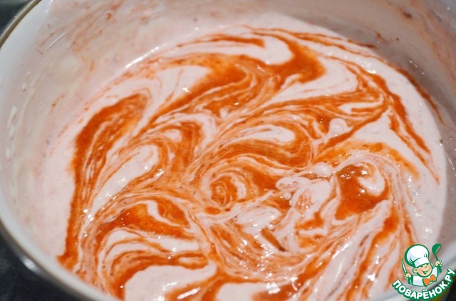 Затем добавьте сюда же оставшееся клубничное пюре и аккуратно перемешайте (например палочкой), делая спиральный рисунок.