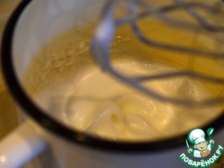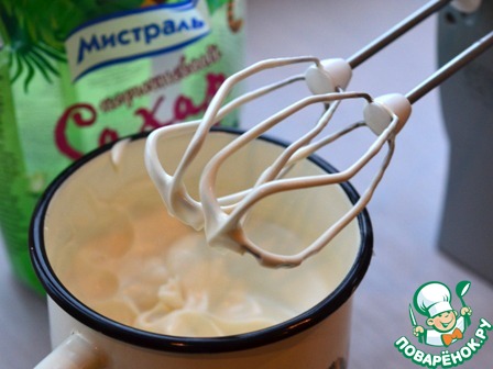 Сразу же, тонкой струйкой, вливаем сироп в белки, не прекращая взбивания ни на секунду! Продолжаем взбивать меренгу до полного остывания.