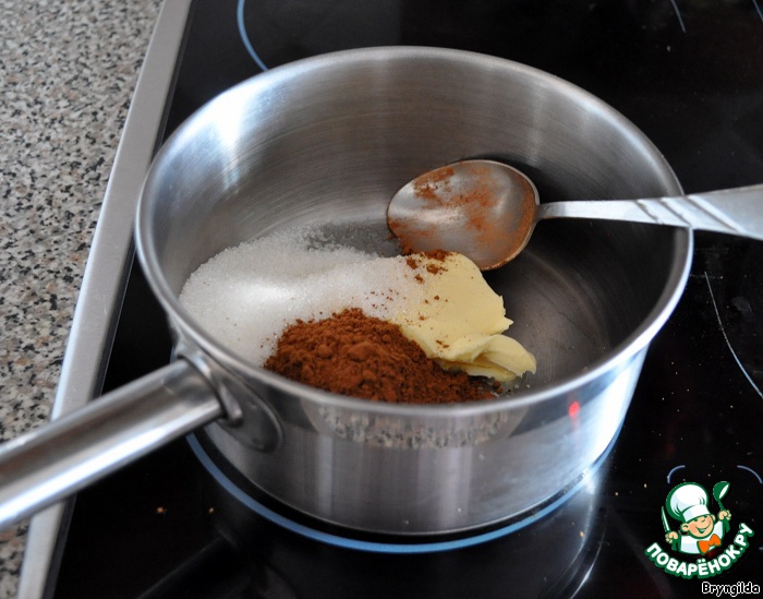 Масло, сахар и какао растапливать на медленном огне.