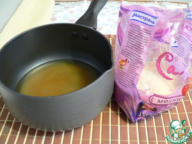 В небольшой сотейник налить воду, добавить коричневый сахар "МИСТРАЛЬ". Нагревать на огне до растворения сахара.