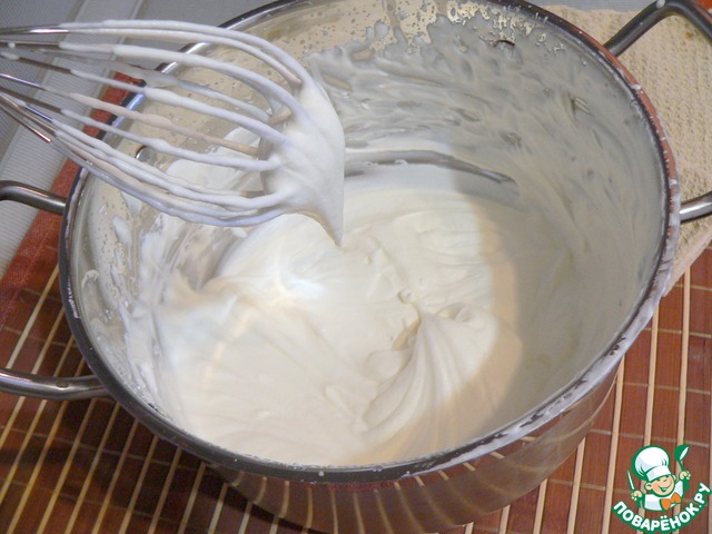 Холодные сливки взбить ручным или стационарным миксером до средних пиков.