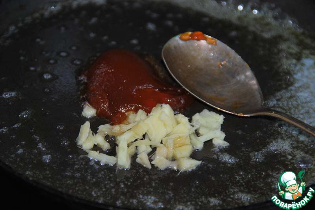 На сковороде растапливаем сливочное масло, добавляем абрикосовый джем, мелко порезанный имбирь и обжариваем пару минут.