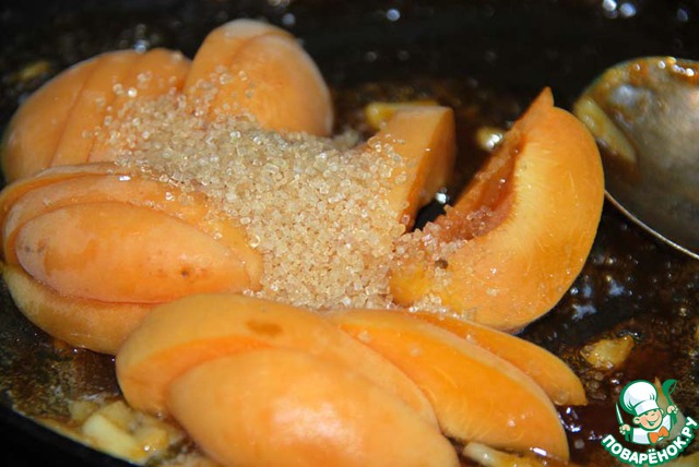На сковороду выкладываем порезанные абрикосы и посыпаем их сахаром коричневым демерара от "Мистраль".