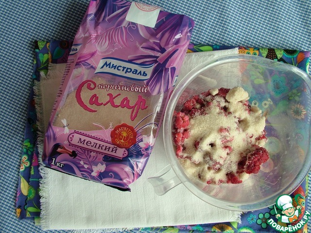 Для малинового пюре я взяла замороженную малину (немного её разморозила) и мелкий коричневый сахар от Мистраль.