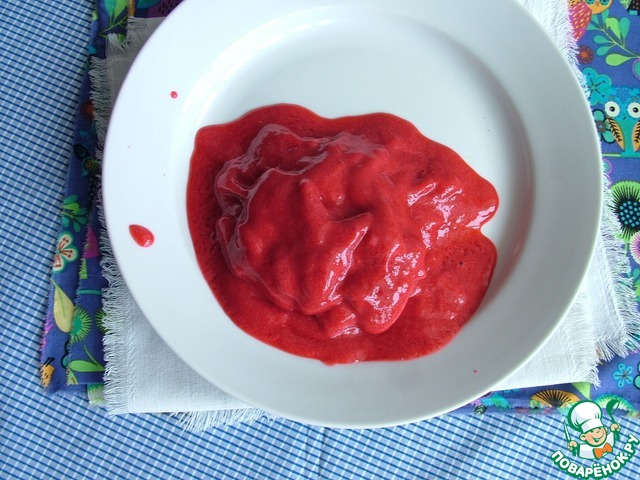 Малину с сахаром растерла блендером и протерла через сито, чтобы удалить семечки.
