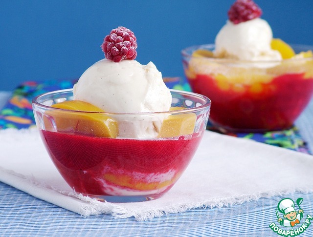 Итак, у нас все готово, осталось только красиво разложить все составляющие в вазочки. Я просто налила в каждую вазочку 50 г пюре, положила шарик мороженого и украсила дольками персика и малинкой. А дальше... наслаждение )))