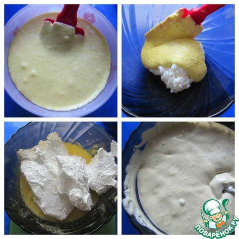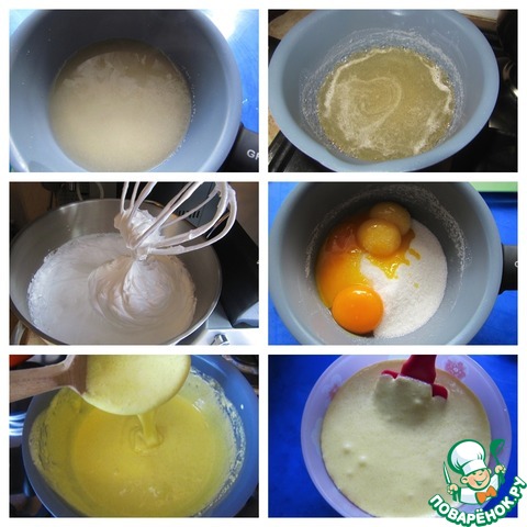 Для приготовления желтковой массы в небольшой кастрюльке смешать сахарную пудру (желательно) или сахар мелкого помола, добавить ванильный сахар, смешать, поставить на водяную баню или осторожно готовить в кастрюле с толстым дном, чтобы только не заварить желтки! Растирать сахар с желтками в пену до увеличения в объеме, загустения и получения рельефных полосок! По времени - на водяной бане около 25 минут, в кастрюльке - около 10-15 минут, затем немедленно переложить готовую массу в другую посуду, чтобы остановить процесс заваривания желтков!