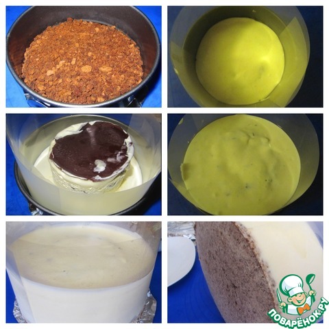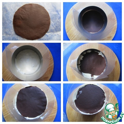 В форме, которой буду собирать основу десерта, бока прокладываю плотным файлом, дно снаружи застилаю 2 слоями пищевой пленки и закрепляю по бокам формы липкой лентой ("скоч"), ставлю кольцо на разделочную доску. Аккуратно поочередно снимаю бумагу с шоколадных дисков, кладу на низ формы, выкладываю рисово-сливочную основу, затем шоколадный диск - сливочный рис и так далее, снизу и сверху должны быть диски. Отправляю в морозилку минимум на 12 часов до ПОЛНОГО замораживания!