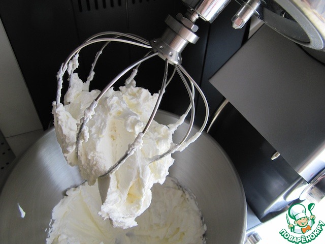 Взбить охлажденные не менее суток в холодильнике сливки с загустителем для сливок, добавить сливочный сыр, взбить, добавить оставшуюся часть желтковой массы - взбить, затем оставшийся белковый заварной крем (если в процессе хранения в холодильнике на дне формы собралась жидкость - слить ее!), перемешать.