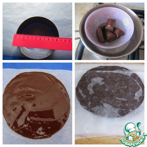 Внутри десерта будет основа из шоколадных дисков, между которыми будет наполнение из сливочного риса. Обвожу 10 раз карандашом форму (у меня кольцо диаметром 10 см) на бумаге для выпечки. Растапливаю шоколад на водяной бане (как только шоколад растопился примерно наполовину - выключаю огонь). Аккуратно силиконовой лопаткой (мне так удобнее) наношу шоколад на бумагу равномерным тонким слоем (5 листов), сверху накрываю каждый листом бумаги, выкладываю заготовки на ровную разделочную доску, сверху накрываю второй доской (чтобы диски были ровные), отправляю в холодильник до полного застывания шоколада.