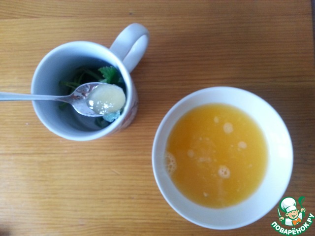 2) Заваренные кипятком веточка мяты и пара листов смородины (можно просто использовать пакетик мятного чая, купленный в магазине) с добавлением половины чайной ложки меда.