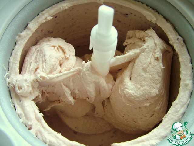 Перелить смесь в мороженницу и замораживать 30 минут. Или отправить в морозилку на 4 часа, каждый час перемешивать