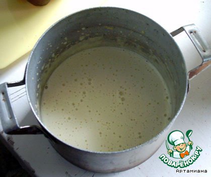 Вскипятить воду в большой кастрюле, снять ее с огня, поставить в нее кастрюльку с желтками и взбивать желтки миксером, пока они не посветлеют и не увеличатся в объеме.