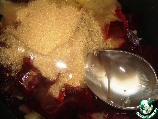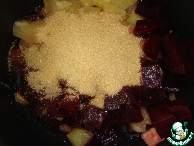 Добавляем к политым лимонным соком кубикам свеклы и ананаса коричневый сахар (больше 3 столовых ложек не нужно - свела сама по себе сладкая, ананас тоже)