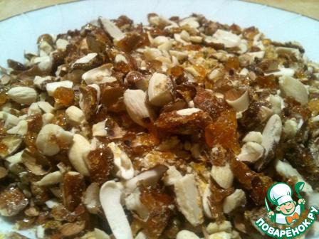Измельчить скалкой, оставляя половинки миндаля целыми.