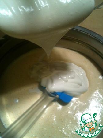 В другой миске взбить сливки до густоты. Затем аккуратно соединить сливки с яично-сахарной массой. Все осторожно перемешать.