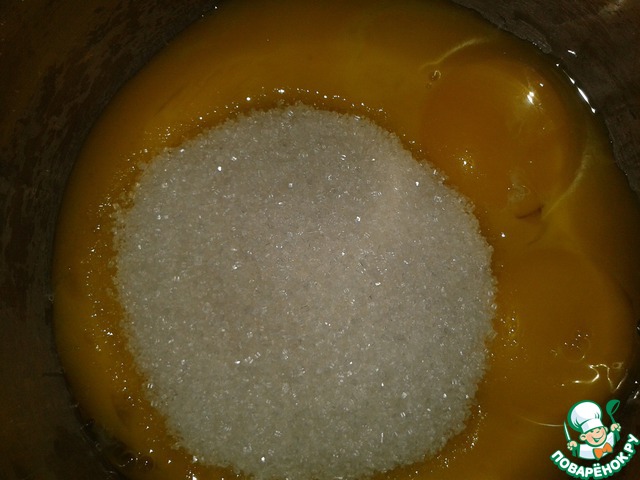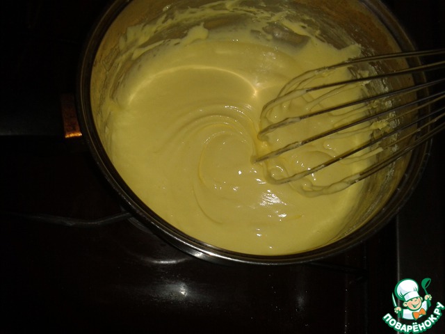 Взять кастрюльку чуть большего размера в диаметре налить немножко воды и довести до кипения. Когда вода закипит, установить в нее кастрюльку с желтками, но на легкий огонь, чтобы вода сильно не кипела. Венчиком постоянно сбивать (я сбивала минут 6, но можно сбивать и блендером или миксером, тогда сбивать минуты 3-4).