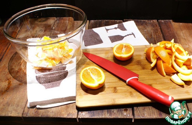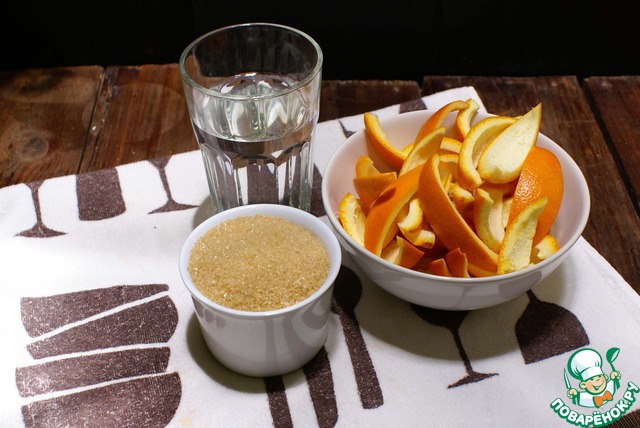 Из стакана воды и половинки стакана коричневого сахара варим сироп на апельсиновых корочках.