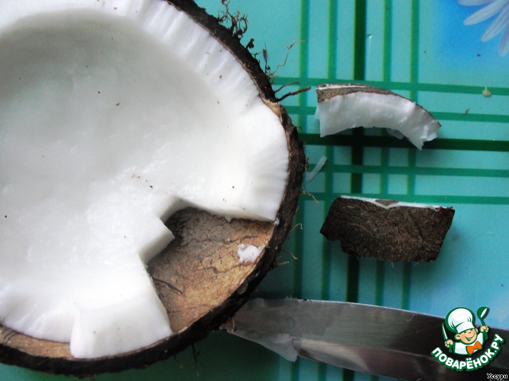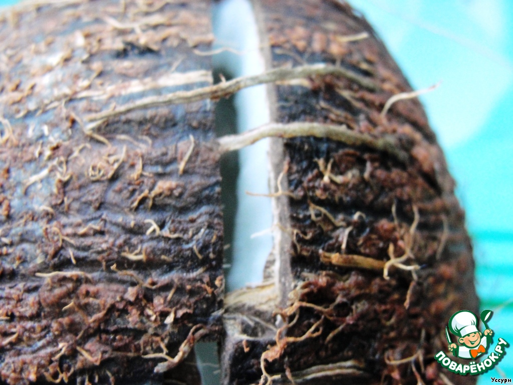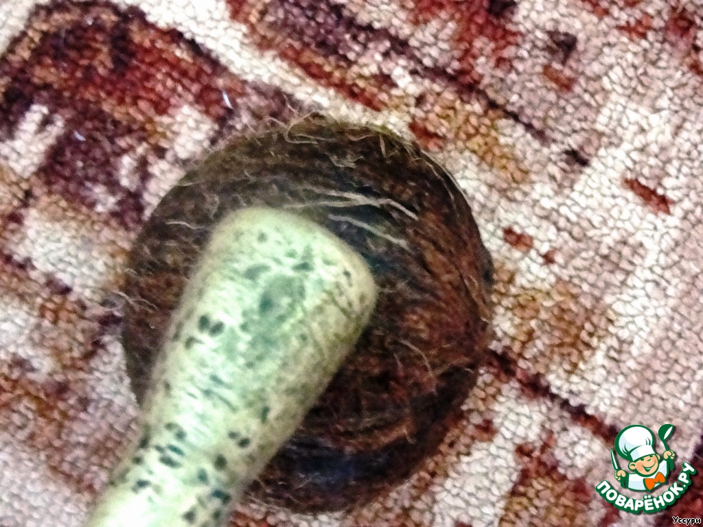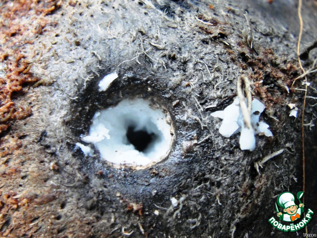 Для начала откроем кокос. Это не так сложно, как кажется. На одной из его макушек-полюсов есть три ямки. Проковыряем одну или парочку отверткой или тонким ножиком. Жидкость, которая находится внутри, сольем, процедим и используем по собственному усмотрению.
