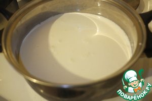 Выливаем в кастрюльку сливки, молоко, насыпаем вторую половину сахара и ставим на водяную баню. До кипения не доводим! На поверхности должны появиться пузырьки.