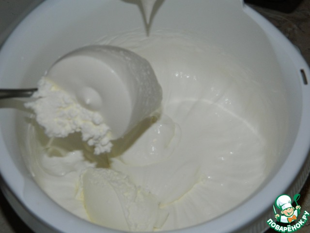Взбить сливки с сахарной пудрой. Добавить творожный сыр. Перемешать до однородного состояния. Поставить в холод на час.