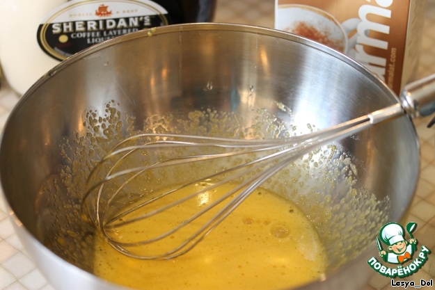 Горячий коктейль тоненькой струйкой ввести в желтковую массу. Хорошо размешать, процедить обратно в кастрюлю и на маленьком огне варить до легкого загустения (не кипятить!!!!). Остудить. Добавить ликер и хорошо взбить.