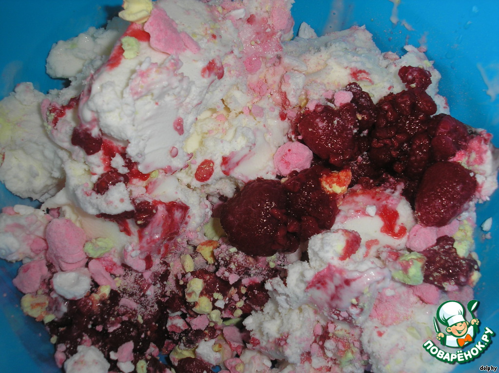 Мороженое положите в миску. Деревянной ложкой смешайте малину и меренги. Если используется замороженная малина, её нужно предварительно разморозить.