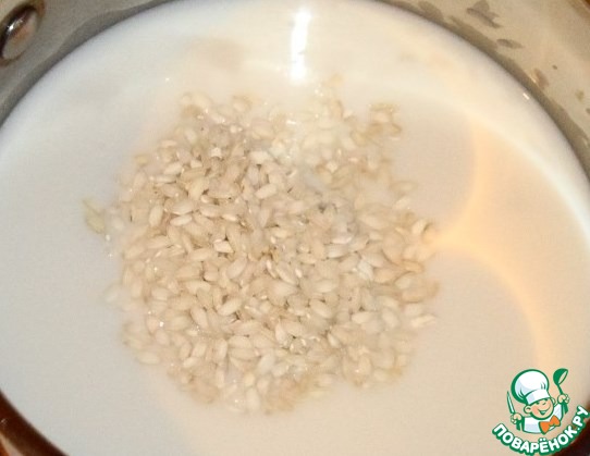 Смешайте в кастрюле кокосовое и коровье молоко, добавьте рис. Доведите смесь до кипения и варите на небольшом огне около 25 минут пока рис не станет мягким. Остудите немного рис.