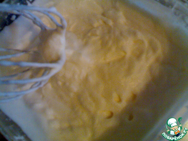 Непрерывно помешивая массу венчиком, влить в желтки молоко (вливать тонкой струйкой).