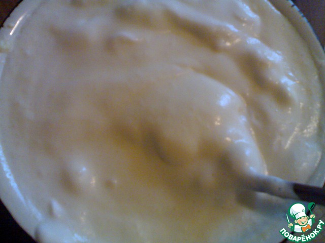 Молочно-яичную смесь поставить на слабый огонь и нагревать, постоянно помешивая деревянной ложкой, пока смесь немного не загустеет.