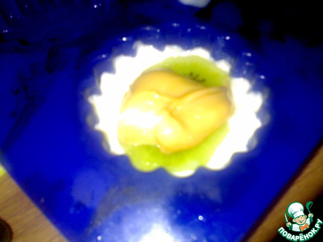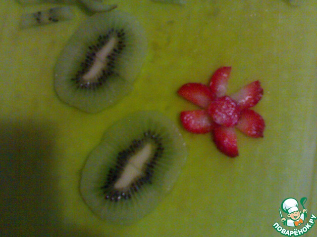 Киви нарезать кружечками и пополам.