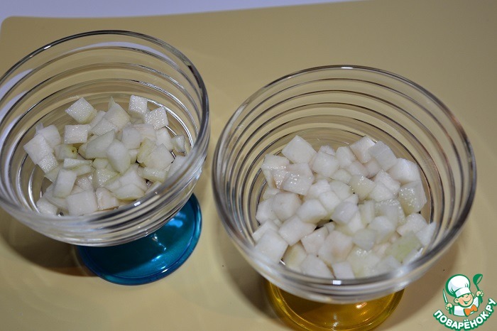 Сверху положить грушу, очищенную от кожицы и семян и нарезанную кубиками.