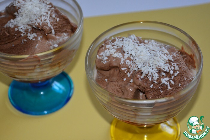 Сверху снова выложить мороженое. И присыпать его кокосовой стружкой.