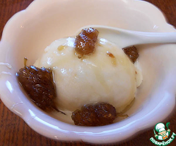 Полить можно любым топингом (я подумала и использовала варенье из шелковицы). Хотя мне показалось, что мороженное вполне самодостаточное и особые топинги ему без надобности.