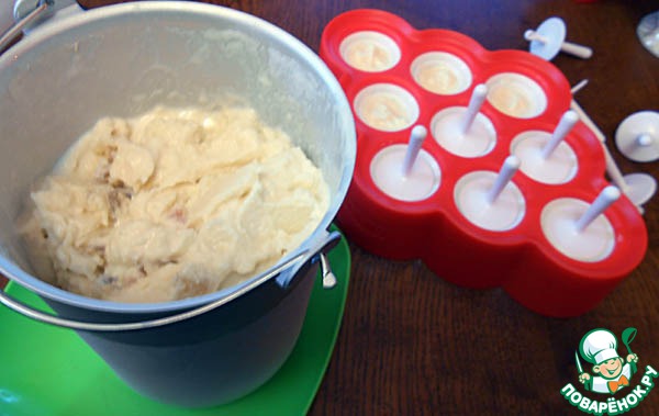 Часть мороженноего выложила в специальные формочки для эскимо (у меня шарикообразные формочки для мини-эскимо от фирмы Zoku) и отправила в морозильную камеру.