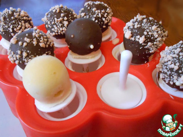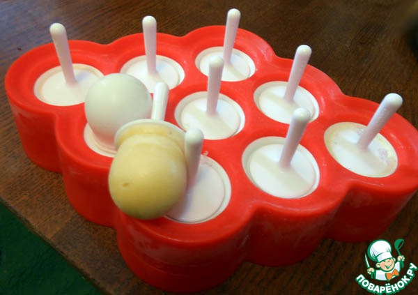 Так шарик выглядит после заморозки. Вынимается очень легко (донышки у формы из мягкого силикона, они легко выворачиваются наружу, когда тянешь эскимо за палочку).