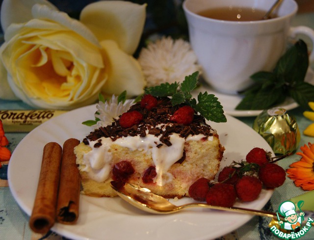 Украшен ягодами, тертым шоколадом и полит сметанно-банановым кремом