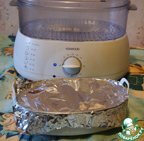Форму сверху прикрываем листом фольги, чтобы конденсат от пара скапливался на нем, а не на пудинге.