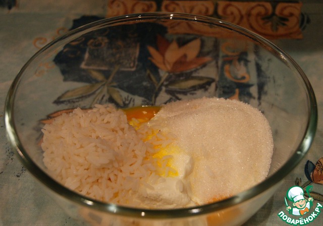 К творогу выкладываем отварной рис+сахар+ваниль+ман ка+сметана+желтки,