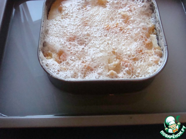 И поставить в глубокий противень. Влить горячую воду так, чтобы она доходила до середины стенок формы с пудингом.
