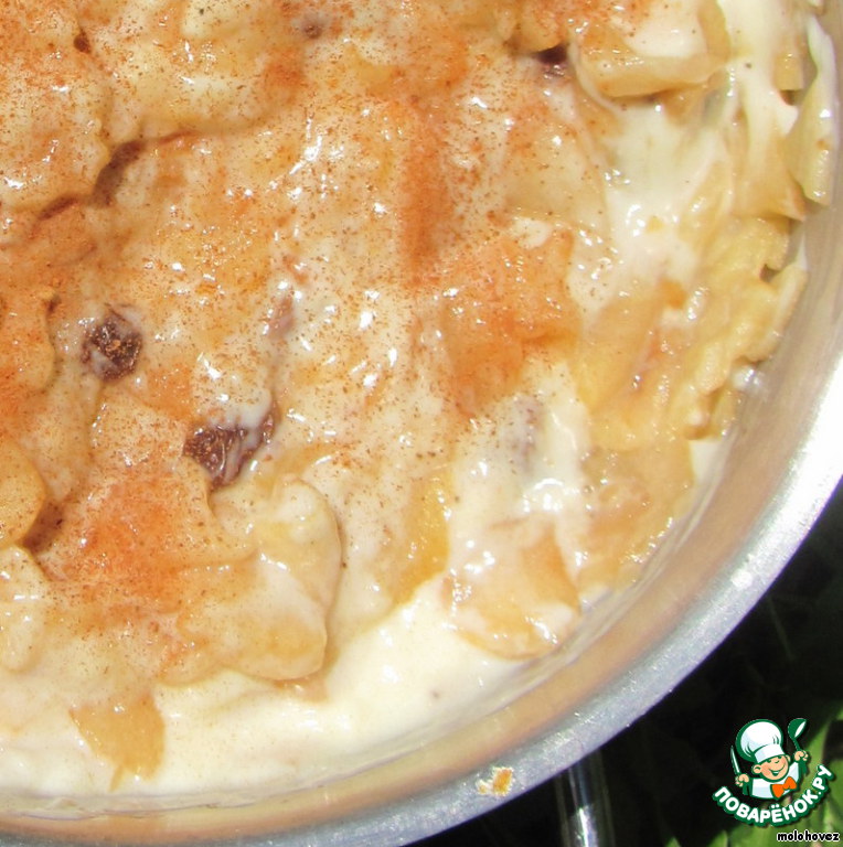 Смешиваем яблоки с пудингом. Добавляем орехи кусочками, изюм и корицу.