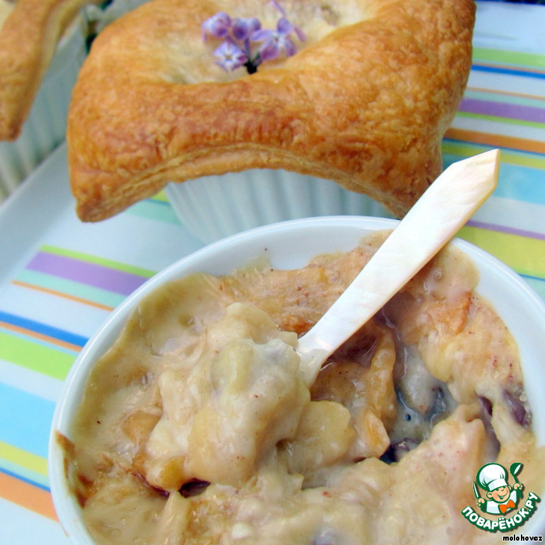 Нарезаем пласт теста на квадратики. Яблочно-пудинговую смесь выкладываем в формы. У меня получилось 5 штук. Кладем сверху квадратик теста. Чикаем пару раз ножницами - для выхода пара. Можно смазать молоком или желтком и посыпать сахаром.