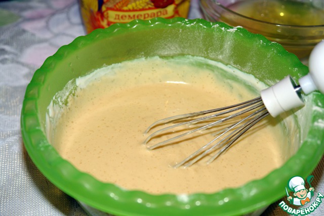 Желтки отделить от белков. К желткам добавить сахар и масло. Все растереть, можно с помощью миксера, можно просто венчиком, взбивать не обязательно. Сахар нужен именно коричневый, так как он придает приятный карамельный вкус, да и полезнее рафинированного.